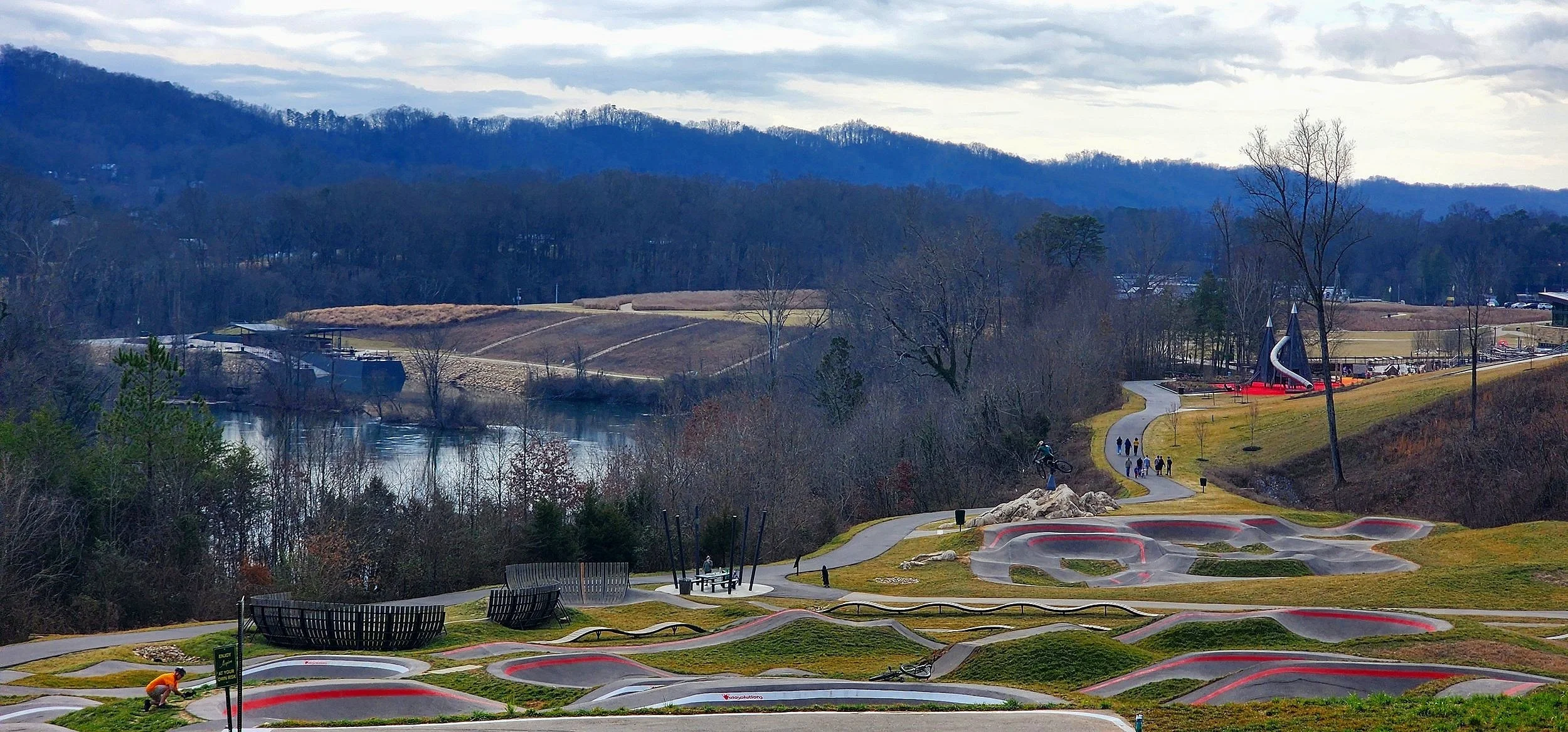 Outdoor recreation abounds at Aspire Park. Visitors can take off into the woods or beside the river along 20+ miles of hiking and biking trails. Professional bikers designed a pump track, too that features adventure for bikers of all skill levels.