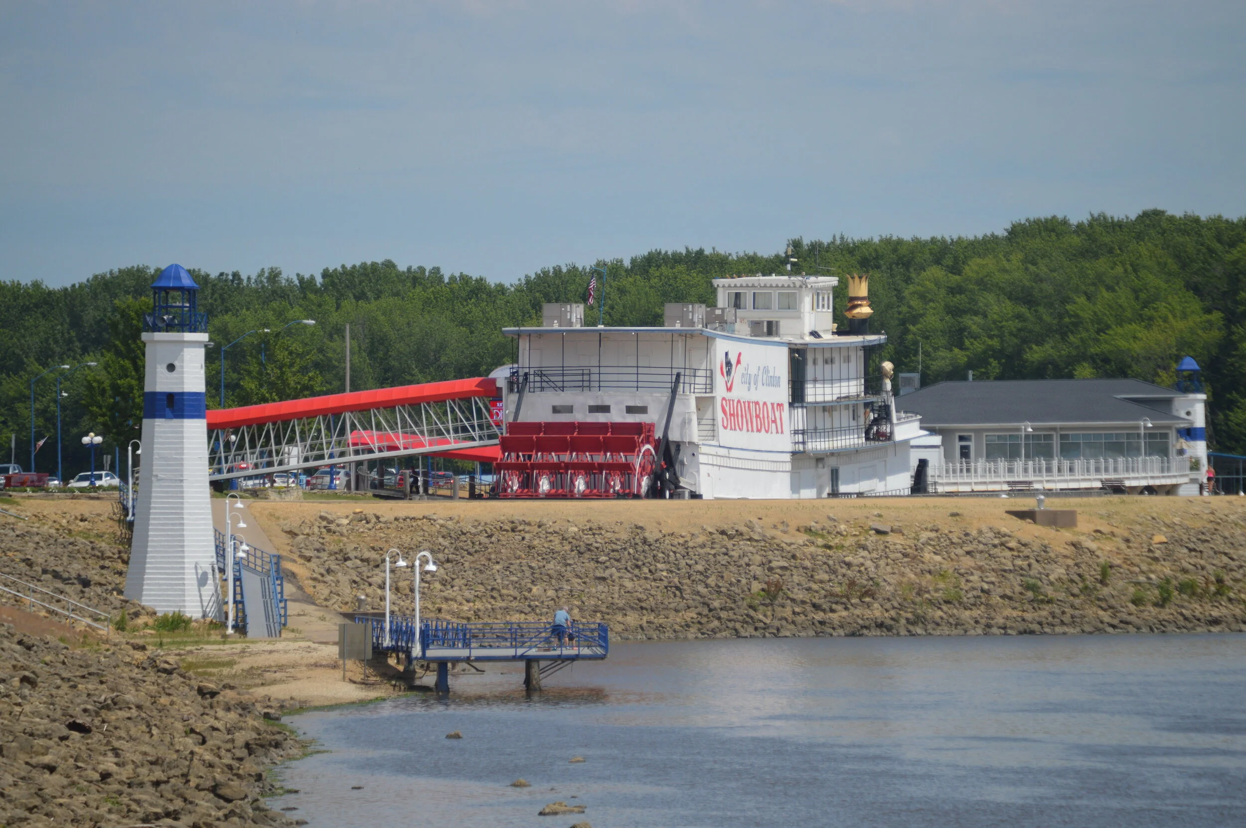 The blue and white lighthouses were built as decorations along the levee in Clinton, Iowa. The Showboat once ran up and down the Ohio River, but sits in Clinton where it houses live theater productions.