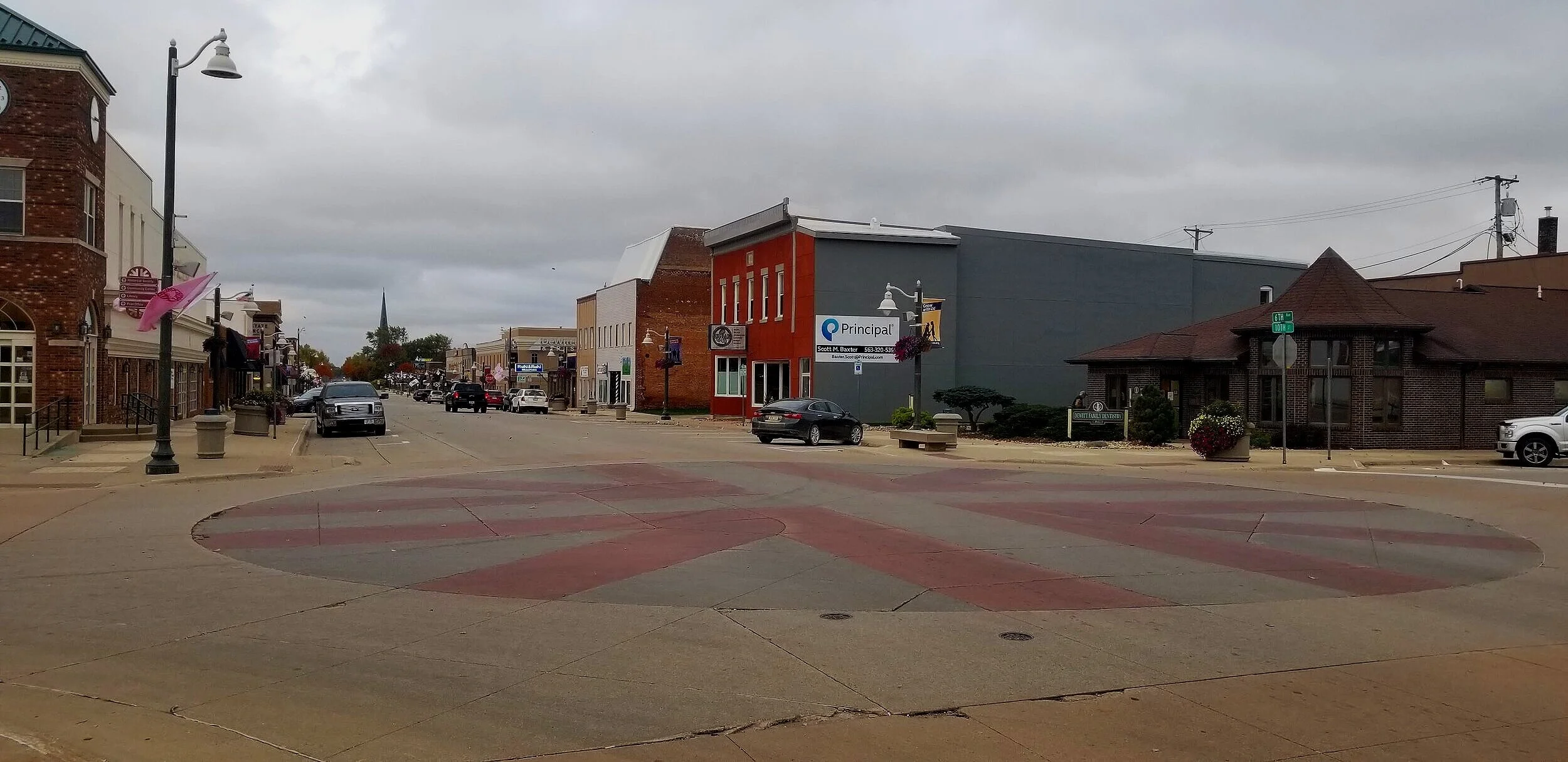 In the heart of the Dewitt (about 20 miles west of Clinton) a colorful array of arrows at the center of a circle marks an historic crossing along the Lincoln Highway. It is at this spot at 10th Street and 6th Avenue that two trans-national highways, U.S. 30 and U.S. 61 (The Blues Highway) came together. Together the two roads covered nearly 5,000 miles.