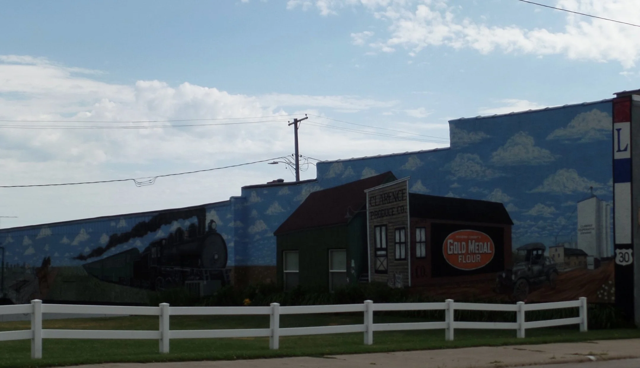 At the corner of Main and Sixth Avenue, you’ll see stripes of red, white and blue with a giant “L” at the center letting you know you’re passing through on the Lincoln Highway. Another striking feature in Clarence is a mural depicting the history of the town’s early railroad days. You’ll find it on a building along Main Street. The edge of the mural has that familiar Lincoln Highway “L” and stripe running down the side of the building.